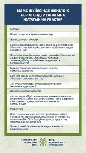 МӘМС жүйесінің қазақстандық моделі әлеуметтік бағдарланған болып табылады. Яғни, халықтың 15 жеңілдік санатындағы 11 млн-ға жуық азаматқа мемлекет жарна төлейді.